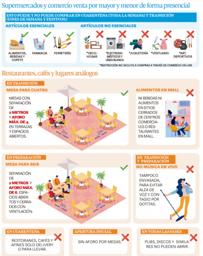 Chao música. Otro de los temas polémicos fueron las modificaciones establecidas para restoranes, cafés y lugares afines (ver info), como la reducción de aforo por mesa (máximo 4 en Transición y 6 en Preparación); además de la prohibición de música en vivo y envasada.