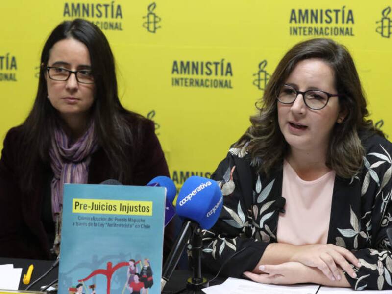 La directora ejecutiva de Amnistía Internacional (AI) Chile, Ana Piquer (i), y la investigadora de (AI) para Sudamérica Valentina Ballesta (d) ofrecen una rueda de prensa para la presentación del informe "Pre-juicios injustos: ley antiterrorista y el pueblo mapuche", sobre casos de violencia en la región de La Araucanía y cómo lo ha tratado el Estado chileno.[/caption]