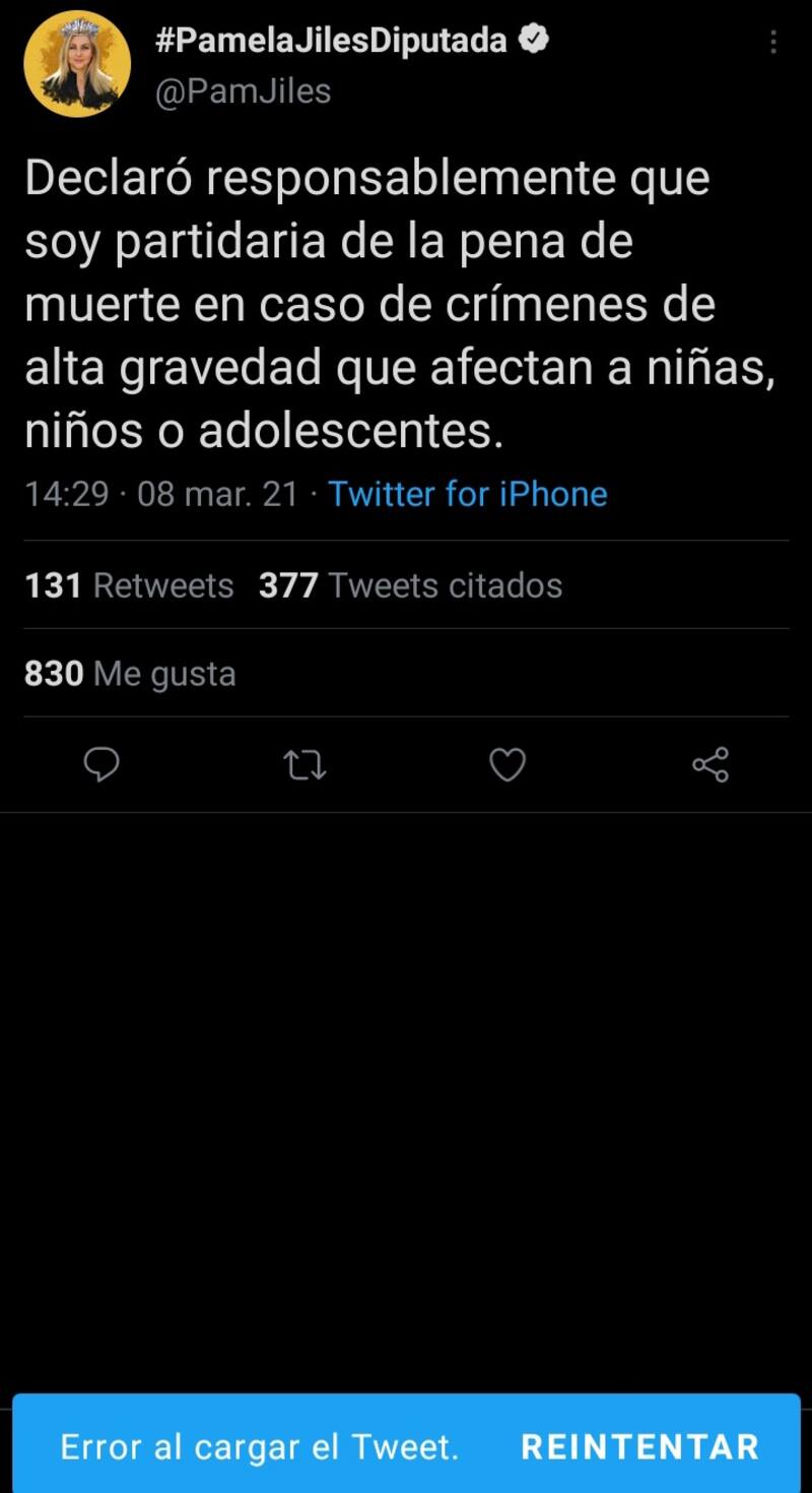 "Declaro responsablemente que soy partidaria de la pena de muerte en caso de crímenes de alta gravedad que afectan a niñas, niños o adolescentes", escribió en la red del pajarito.