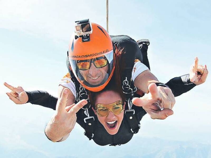 contarlo hasta que sean viejitas y viejitos. Entre los requisitos para saltar es tener 18 años ó 16 años con permiso notarial de los padres, no sufrir enfermedades cardíacas o condición médica que implique riesgo, pesar menos de 100 kilos y más de 30 kilos y medir menos de dos metros de altura. El salto para dos personas, y que incluye un video, está a $304.000 en Paracaidismo Chile (www.paracaidismochile.cl). Si anda solita o huachito por la vida, te costará $160.000 con video incluido.