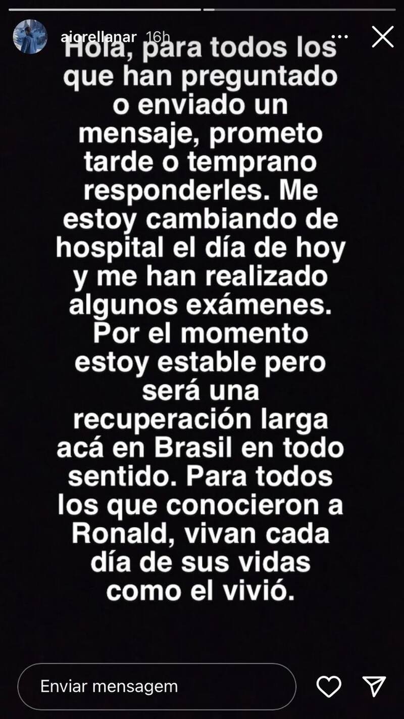 Asimismo, contó que “me estoy cambiando de hospital, el día de hoy y me han realizado algunos exámenes. Por el momento estoy estable, pero será una recuperación larga acá en Brasil”.