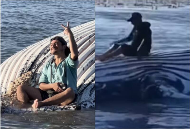 Frente a aquel escenario del cadáver 15 metros de largo y de unas 30 toneladas varado en la costa, a un tipo no se le ocurrió nada mejor que sentarse sobre los restos volcados proceder a sacarse fotos sonriendo y haciendo gestos con las manos.