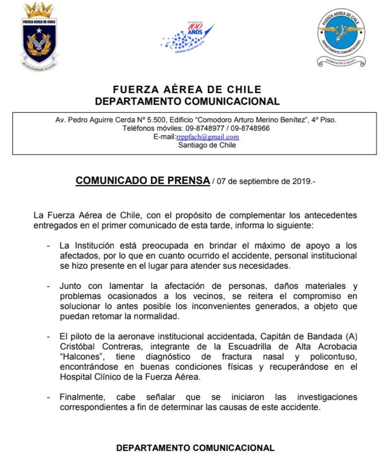 Jugada que finalmente salvó al capitán Cristóbal Contreras, quien se encontraba piloteando la nave. Tras ello la FAch señaló que "tiene diagnóstico de fractura nasal y policontuso, encontrándose en buenas condiciones físicas y recuperándose en el Hospital Clínico de la Fuerza Aérea".