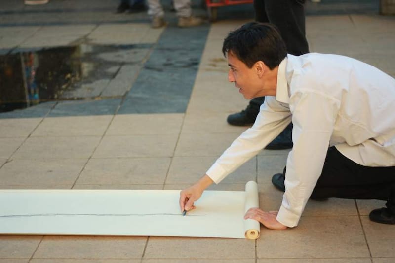 Rodrigo Vicencio durante una acción de arte en el centro de Villa Alemana.[/caption]