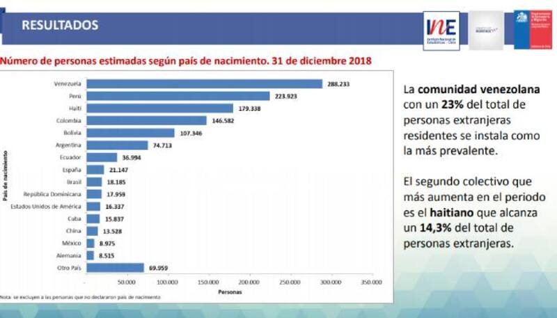 Los ciudadanos venezolanos se instalaron en el primer lugar con 288.233 personas, equivalente a un 23% del total de extranjeros residentes en el país; desplazando al segundo lugar a la comunidad peruana, con 223.923 personas, es decir, un 17,9% del total.