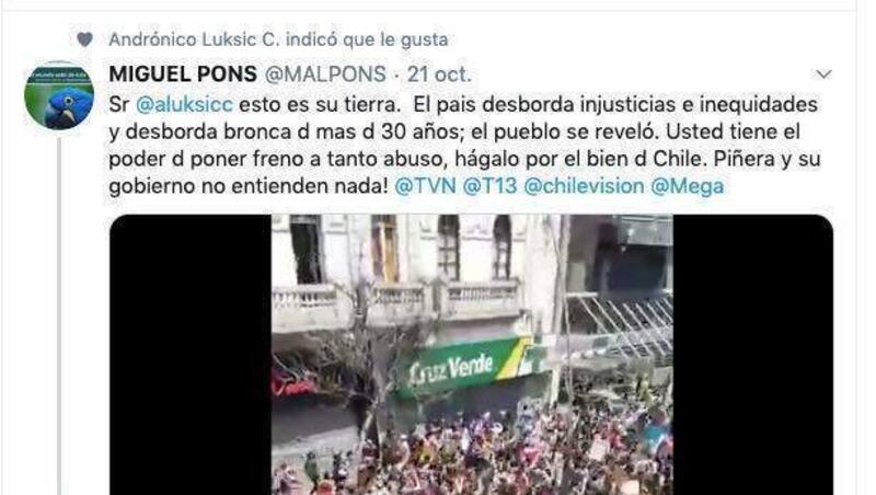 En medio de las protestas masivas que hay en diversos puntos del país, Andrónico Luksic sorprendió a los tuiteros al reaccionar contra Sebastián Piñera. Esto, luego de que el empresario le pusiera un "me gusta" a una publicación dirigida contra el Presidente.