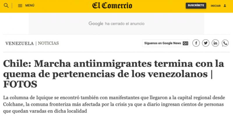 Desde Perú, El Comercio se sirvió del testimonio de varios migrantes venezolanos para explicar lo que pasó en una nota que titularon "Chile: Marcha antiinmigrantes termina con la quema de pertenencias de los venezolanos".