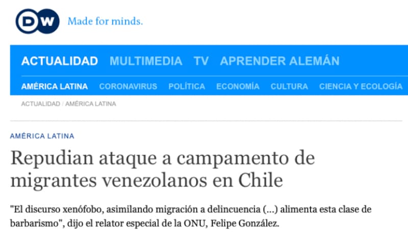 En Alemania, en tanto, el portal Deutsche Welle se refirió a lo sucedido como una "violenta marcha contra inmigración irregular en el norte de Chile".