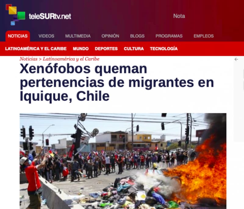 En Venezuela, sin ir más lejos, Telesur informó que "grupos xenófobos realizaron el sábado una manifestación y quemaron pertenencias de un grupo de un centenar de migrantes que acampaba en una zona de la ciudad de Iquique".