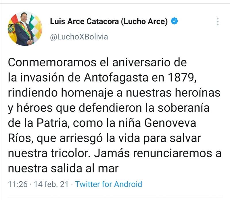 En el marco de la conmemoración del aniversario de la invasión a Antofagasta hecha por Bolivia en 1879, el mandatario entregó su firme postura a través de su cuenta de Twitter.