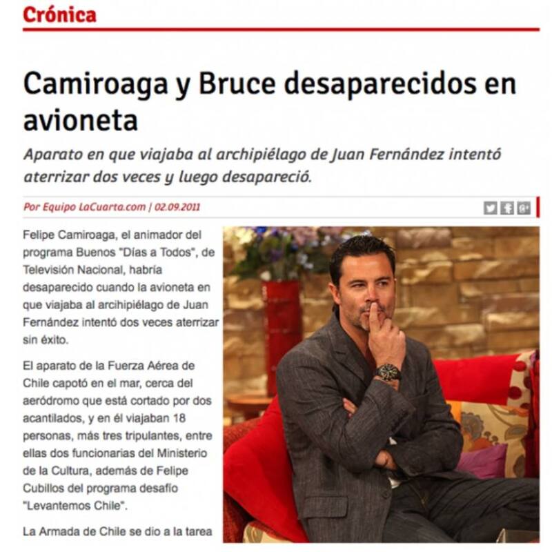 "Felipe Camiroaga, el animador del programa Buenos 'Días a Todos', de Televisión Nacional, habría desaparecido cuando la avioneta en que viajaba al archipiélago de Juan Fernández intentó dos veces aterrizar sin éxito".