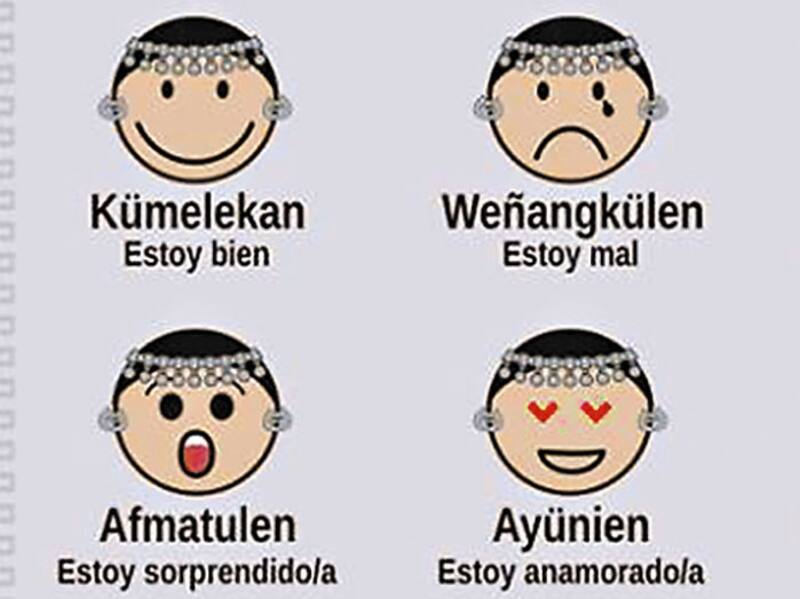 Es por eso que el profe mapuche Víctor Carilaf, capo en lengua mapudungun, se juntó con el dibujante chileno y residente en Inglaterra Fiestóforo, para desarrollar “estados de ánimo” con monitos que incorporaron elementos de la ancestral cultura y escritos en su propio idioma.