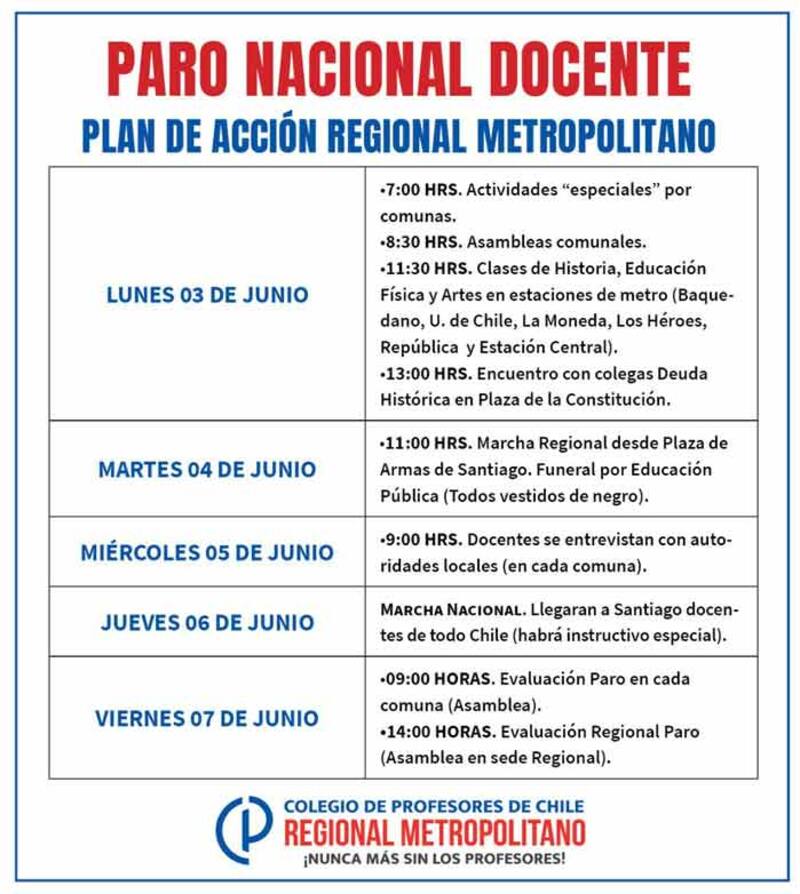 Según detalló, "las primeras actividades los primeros días de la semana van a ser actividades más bien locales. Habrá manifestaciones en las distintas comunas, habrá marchas, asambleas. El martes habrá marchas regionales, también está programado aquí en la Región Metropolitana".