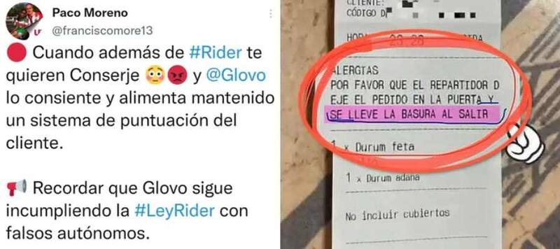“Cuando además de rider te quieren de conserje y Glovo lo consiente y alimenta. Recordar que Glovo sigue incumpliendo la Ley rider - que regula la relación entre los repartidores y las empresas de delivery- con falsos autónomos”, manifestó, en defensa del repartidor.