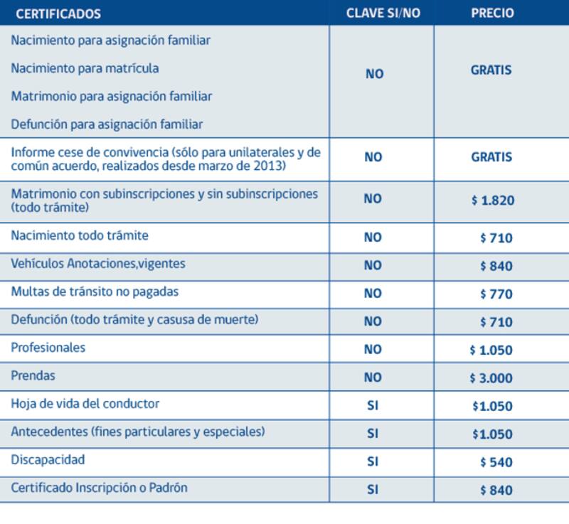 - A través de la web se pueden solicitar documentos gratuitos que te llegarán a tu correo eletrónico. Éstos son el de nacimiento para asignación familiar, de nacimiento para matrícula, de matrimonio para asignación familiar, de defunción para asignación familiar y de cese de convivencia. Si pagas, también puedes pedir los de matrimonio, de vehículos (anotaciones, multas, hoja de vida), de antecedentes (requiere Clave Única), de discapacidad (necesita Clave Única), de nacimiento, de defunción, certificados profesionales y de prendas.