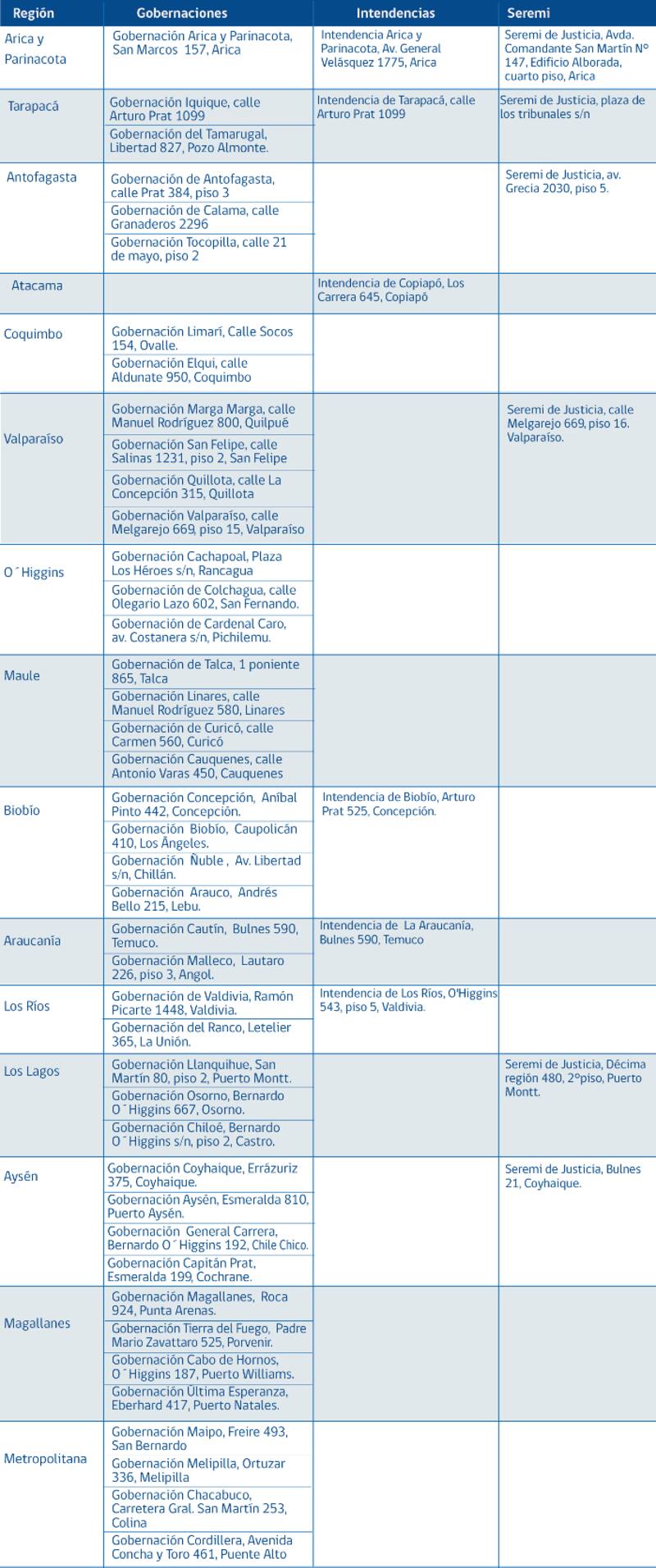 - En la Región Metropolitana se atenderá en Amunategui 76, Santiago; y en la Gobernación Cordillera, ubicada en Avenida Concha y Toro 461, Puente Alto.