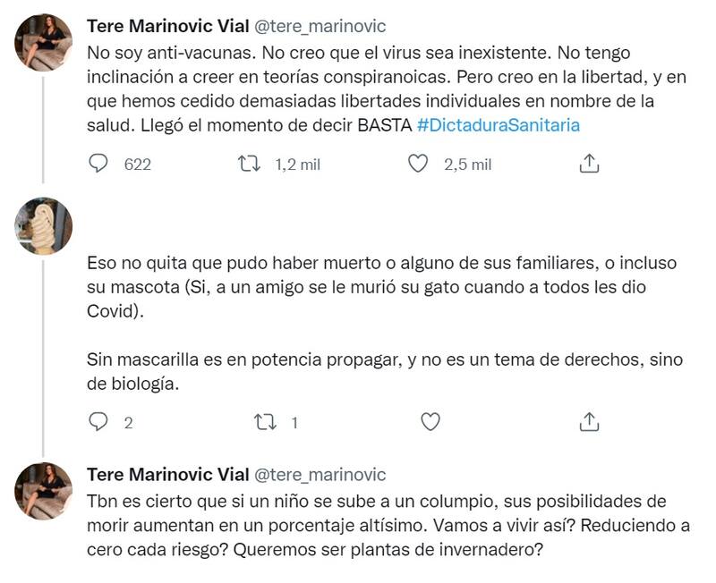 “No soy antivacunas. No creo que el virus sea inexistente. No tengo inclinación a creer en teorías conspiranoicas. Pero creo en la libertad, y en que hemos cedido demasiadas libertades individuales en nombre de la salud. Llegó el momento de decir basta”, escribió Marinovic en la red del pajarito.