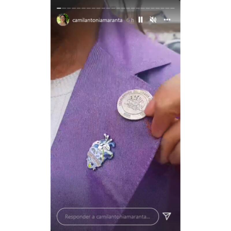 Otro detalle del traje, aunque se trate de un accesorio externo, lo dio a conocer la propia ministra Vallejo en su cuenta de Instagram: allí, subió una imagen donde se puede apreciar el pin que llevaba, con la frase “Pelea como chica”.