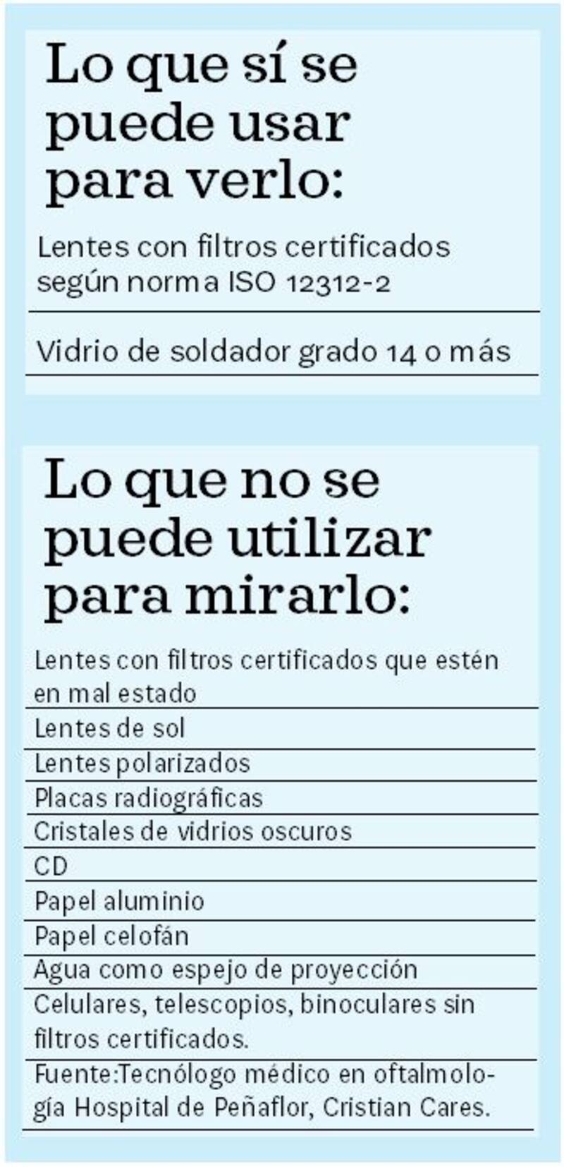 El tecnólogo médico en Oftalmología del Hospital de Peñaflor, Cristian Cares, recomendó el uso de lentes con filtros especiales certificados y en buen estado durante todo el período que se produce el fenómeno, "en ratos cortos y en forma intermitente para evitar daños en la visión (llegando incluso a la ceguera)".