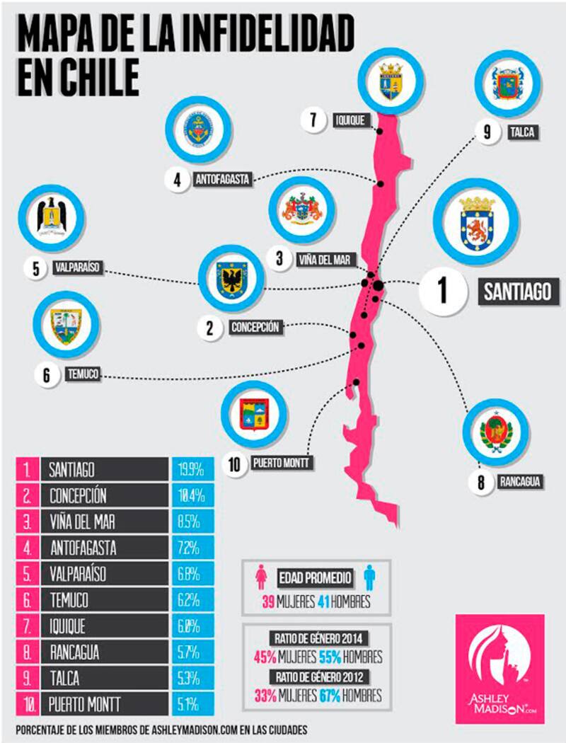 "La gran mayoría de los 'patas negras' se concentran en Santiago y los menos, en Puerto Montt. Esto vendría a corroborar el estudio que hicimos el año pasado a nivel Latinoamericano, donde Santiago resultó ser la ciudad más infiel de Latinoamérica y Antofagasta ocupó en esa época el décimo lugar de la región", agrega Francisco Goic, country manager de AshleyMadison.com.
