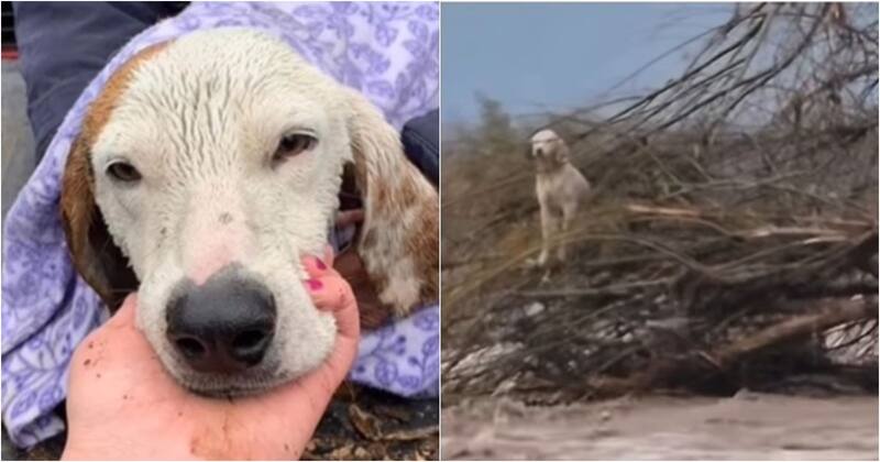 En el video compartido se puede ver al perrito muy quieto sentado arriba del árbol caído, mientras está completamente aislado en medio de la fuerte corriente del río.