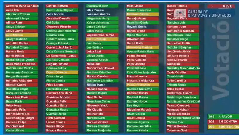 La Cámara de Diputadas y Diputados rechazó la Acusación Constitucional contra el ministro de Desarrollo Social, Giorgio Jackson Drago. Hubo 68 votos a favor, 76 en contra y 6 abstenciones.