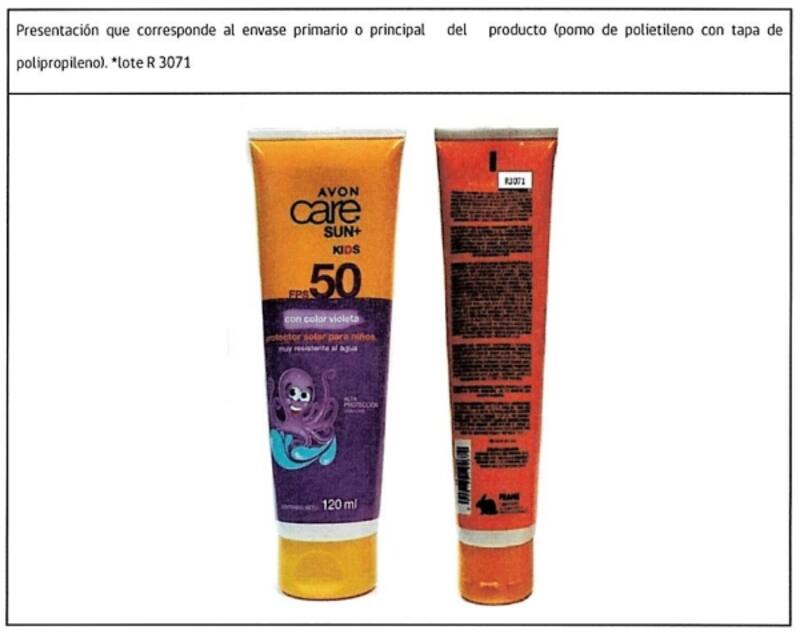 Los productos en cuestión son los lotes R3071 del producto “Avon Care Sun+ Kids FPS 50 protector solar para niños con color violeta muy resistente al agua, alta protección UVA-UVB” y el R0282 de “Avon Anew Solar Advance FPS 50 UVA/UVB Ultra Mate Protector Solar Facial Anti Edad”.