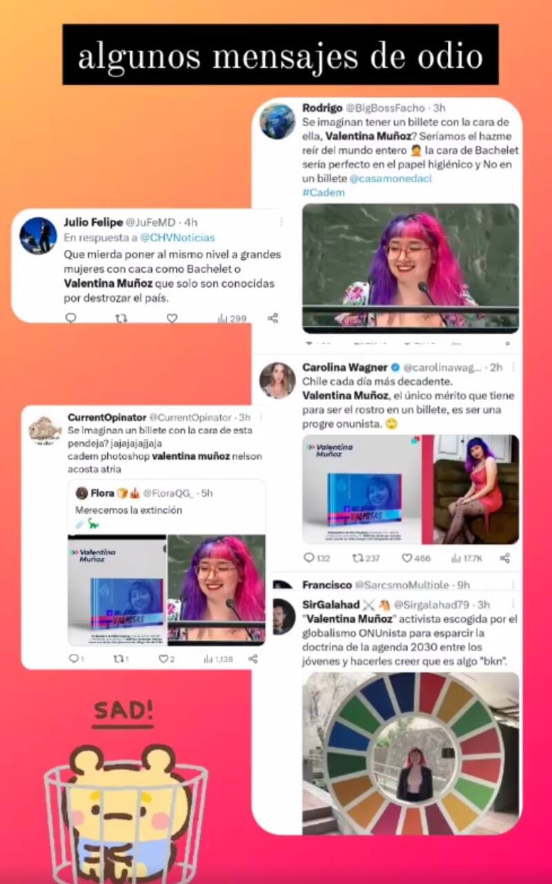 A través de redes sociales, la Defensora de los Derechos Digitales afirmó que “mi nombre #ValentinaMuñoz es TT (tendencia) en Chile gracias al odio de la gente. NO SOY TIKTOKER, NO SOY INFLUENCER. Soy activista y divulgadora científica. Si no me quieren en el billete, voten por alguien más, pero no hay necesidad de insultarme ni desmerecer mi trabajo”.