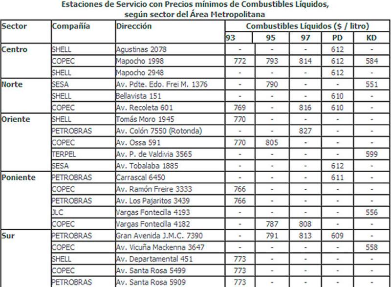 Dentro de las estaciones de servicio más baratas, en la lista aparecen la Shell de Agustinas, en el Norte la de Presidente Eduardo Frei; en el Oriente la Petrobras de Avenida Colón, en el Poniente la Copec de Ramón Freire y en el Sur, cinco estaciones de servicio de las mismas marcas.