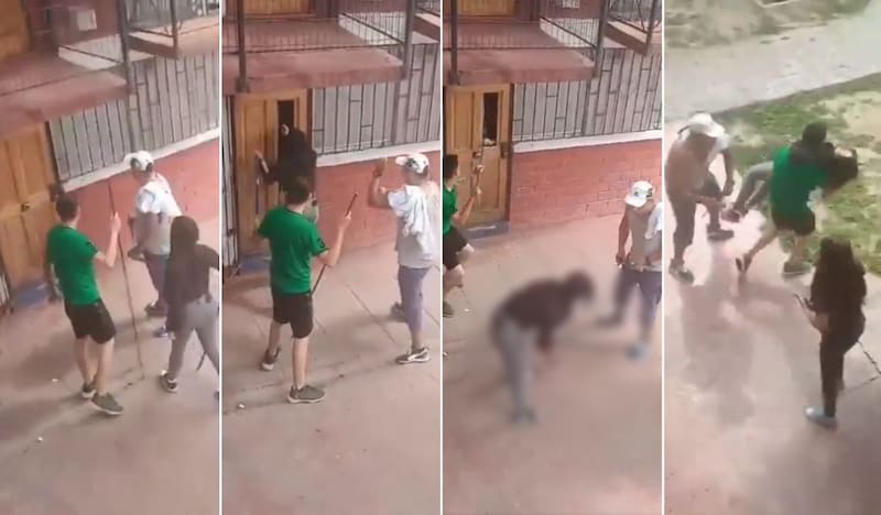 Según se puede observar en un video grabado por un vecino, la joven que participaba de la riña en un segundo se acercó a la puerta y por un agujero recibió, desde el interior, una fatal herida en el cuello.