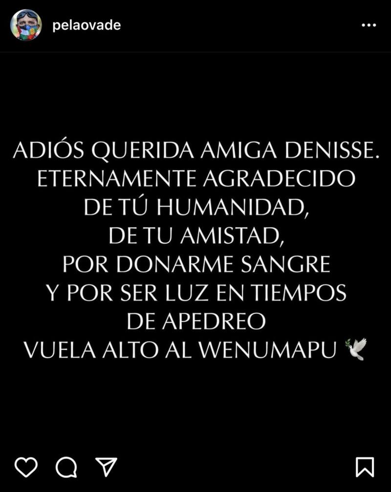 "Adiós querida amiga Denisse. Eternamente agradecido de tu humanidad, de tu amistad, por donarme sangre y por ser luz en tiempos de apedreo. Vuela alto al Wenumapu", escribió Rojas Vade en su historia de Instagram, generando diversas reacciones.