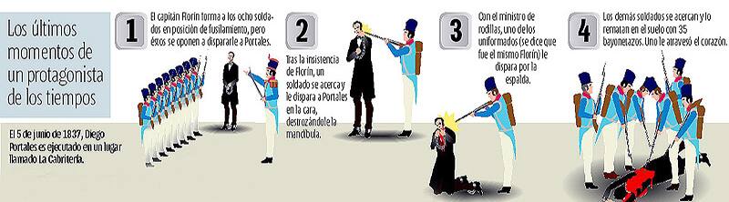El futuro policía agrega que "el día 5 la marcha fue ininterrumpida y, a eso de la medianoche, se detienen en Viña del Mar para comer. A las 03.00, la comitiva ya está en el límite de los cerros Placeres y Barón. En ese lugar, llamado La Cabritería, el capitán Santiago Florín le dispara a quemarropa a Portales y ordena rematarlo a bayonetazos, recibiendo 35 cortes que le producen la muerte en 15 minutos".