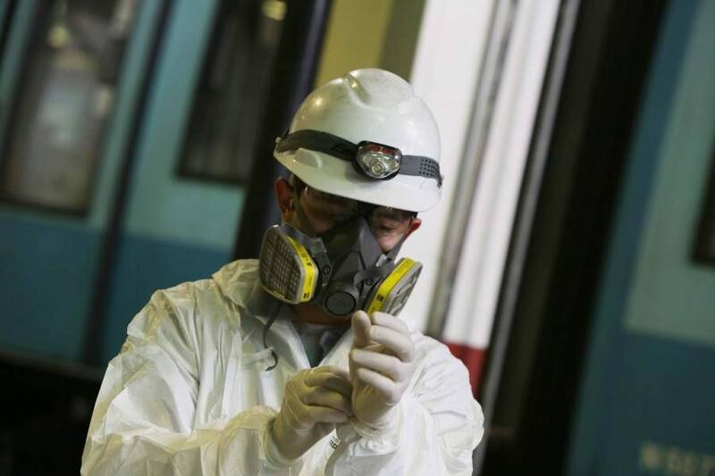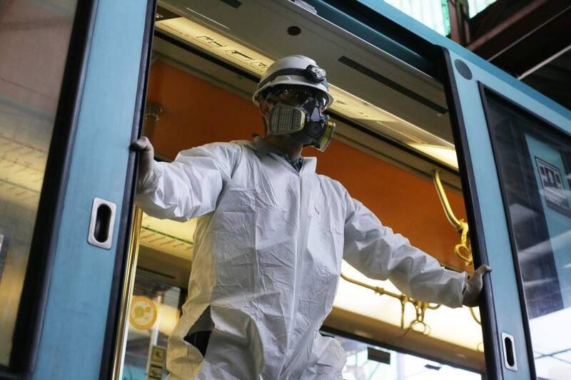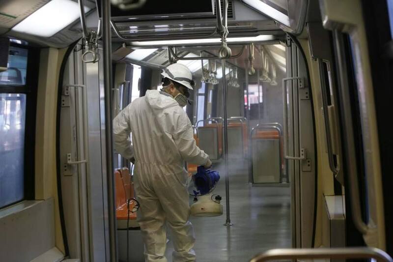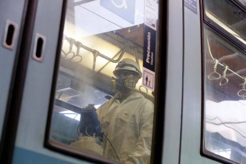 Cada tren se va rociando de extremo a extremo con amonio cuaternario, el mismo producto que se utiliza en los hospitales. Con particular meticulosidad va rociando nanopartículas en cada rincón del vagón. Así, nos dicen, queda libre de este bicho maldito por un periodo de 90 días.