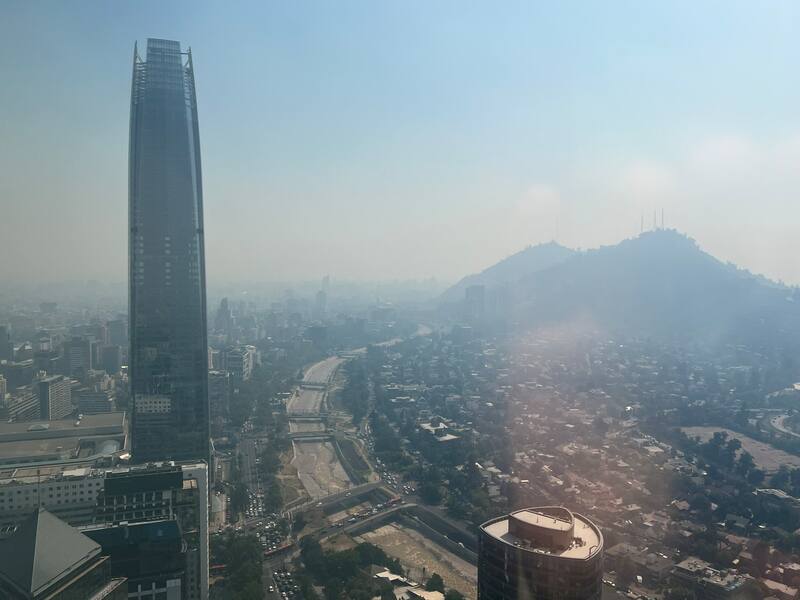 El humo de los dos incendios avanzaba por los cielos de gran parte de la Región Metropolitana, con caía de cenizas en distintos sectores. Un escenario que representa un riesgo para la salud de los capitalinos.