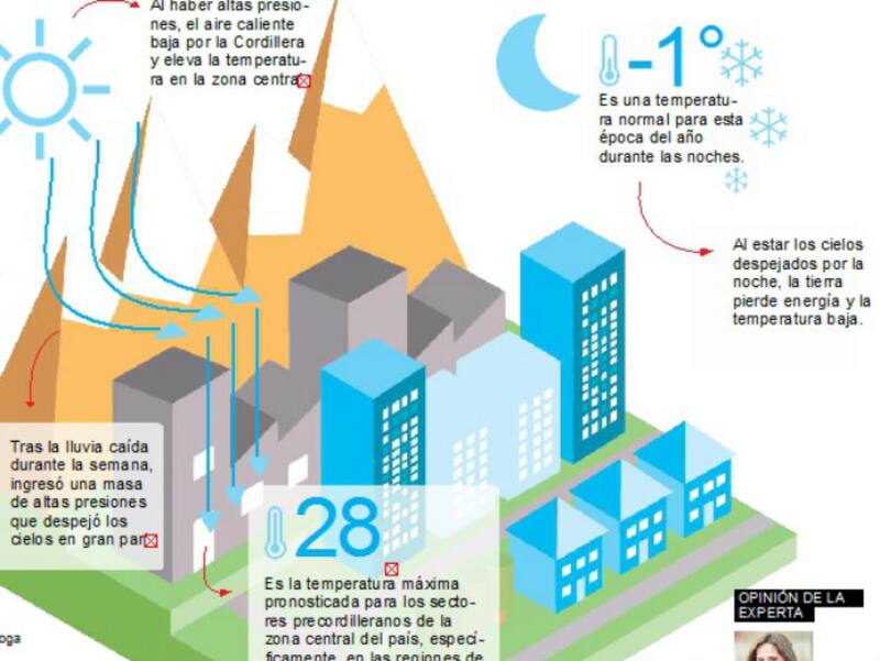 Eso sí, el por qué se producen estos cambios tiene una explicación científica. Según contó la profesional en la materia "después de la lluvia y nieve caída ingresó una masa de aire de altas presiones, que es el que nos entregó los cielos despejados y temperaturas inusuales, como los 28°C que están pronosticados. Entonces, al haber altas presiones, el aire caliente baja por la Cordillera y eleva la temperatura en la zona central del país, específicamente en los valles".
