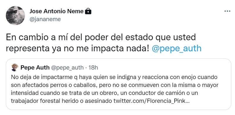 “No deja de impactarme que haya quien se indigna y reacciona con enojo cuando son afectados perros o caballos, pero no se conmueven con la misma o mayor intensidad cuando se trata de un obrero, un conductor de camión o un trabajador forestal herido o asesinado”, planteó.