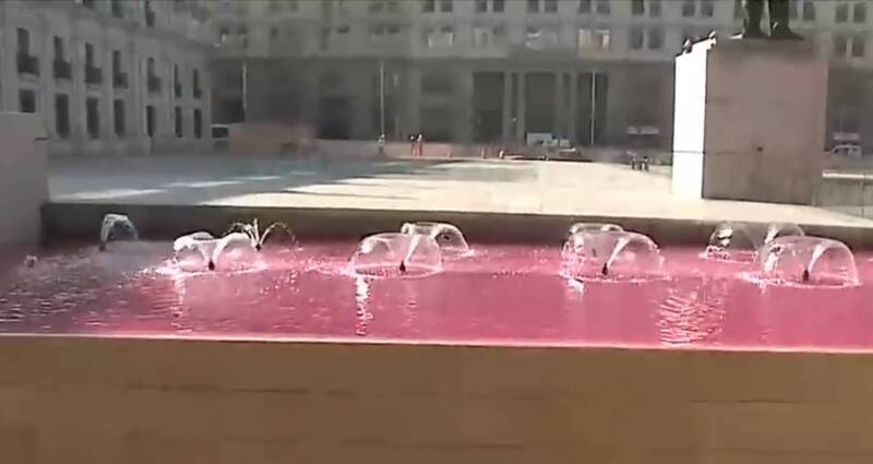 A la misma hora que se desarrollaba la ceremonia de cierre de la Convención Constitucional, un desconocido tiñó de rojo el agua de una pileta ubicada en el frontis de La Moneda.