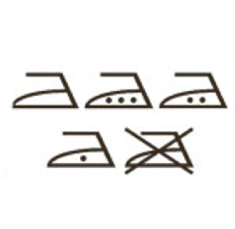 El símbolo es una plancha, en cuyo interior aparecen uno, dos o tres puntos, según la temperatura máxima. Un punto, 110ªC máximo, seda natural o rayón; dos puntos 150 ªC máximo, lana, mezclas y poliéster; y tres puntos, 200ªC máximo, algodón, lino, etc.