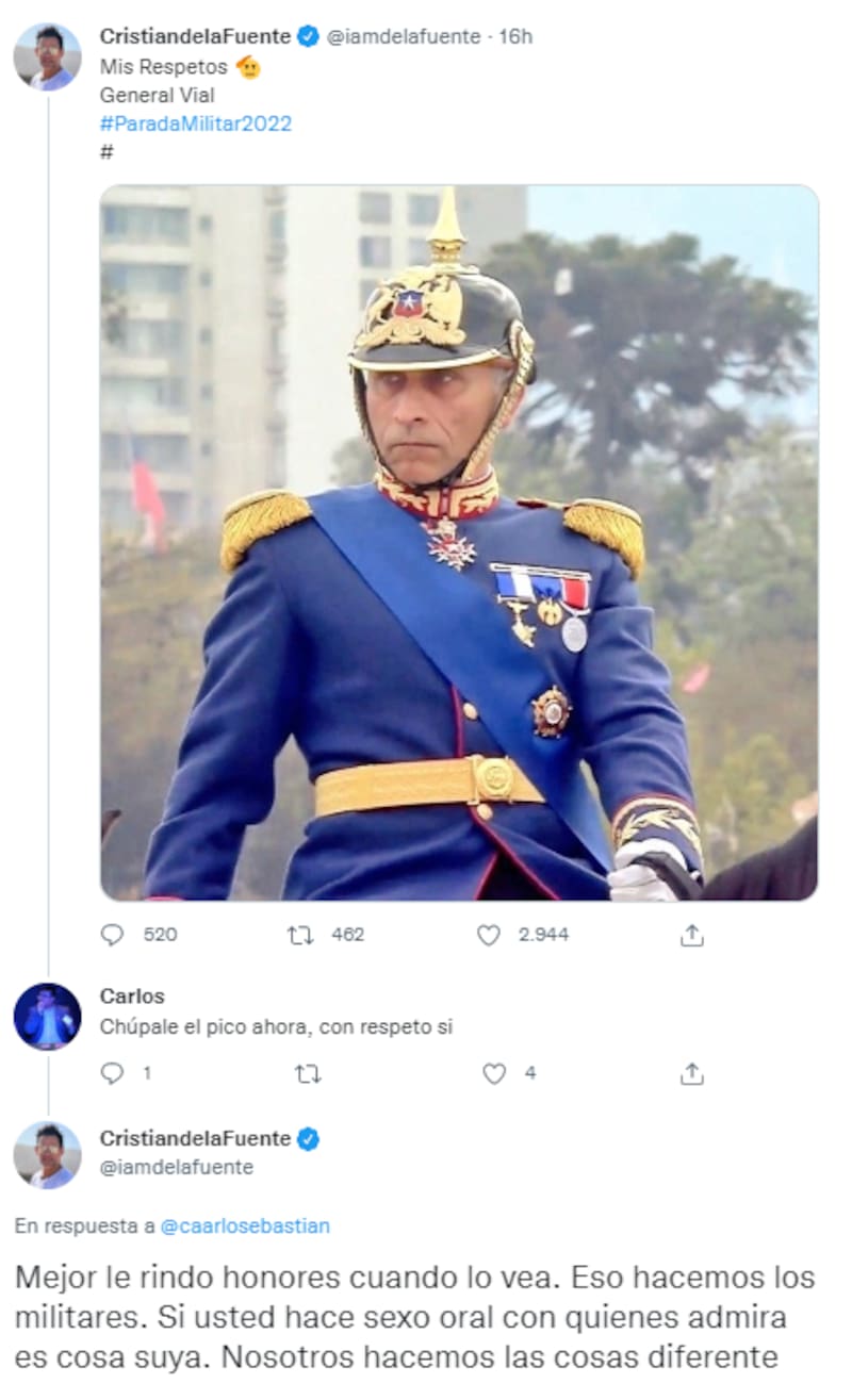 A los pocos minutos, de la Fuente replicó: “Mejor le rindo honores cuando lo vea. Eso hacemos los militares. Si usted hace sexo oral con quienes admira es cosa suya. Nosotros hacemos las cosas diferente”.