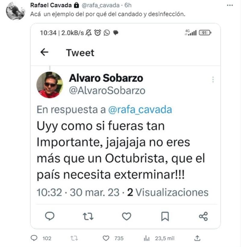 Para graficar su decisión, puso como ejemplo un odioso tuit donde un sujeto le dice: “No eres más que un octubrista, que el país necesita exterminar”.
