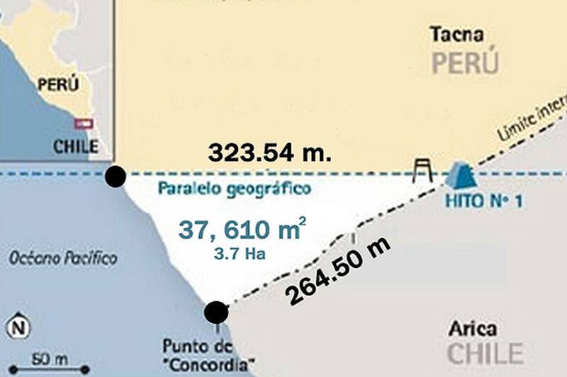 El triángulo terrestre se forma a partir del Hito 1, definido recientemente por La Haya como el inicio del límite marítimo entre ambos países, que se proyecta hacia el mar en un paralelo y el punto Concordia o "punto 266", ubicado unos 300 metros hacia el sureste por el borde costero.