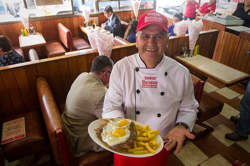 "Para estas fechas contrataba a más de 200 personas, entre músicos, productora, cocineros, garzones y guardias, pero por la pandemia todo queda en el recuerdo. Este año me iba a poner en Paine, pero ahora lo pasaré fondeado en mi casita con mi familia", dice Zacarías mientras atiende puertas afuera de su local en la Alameda.