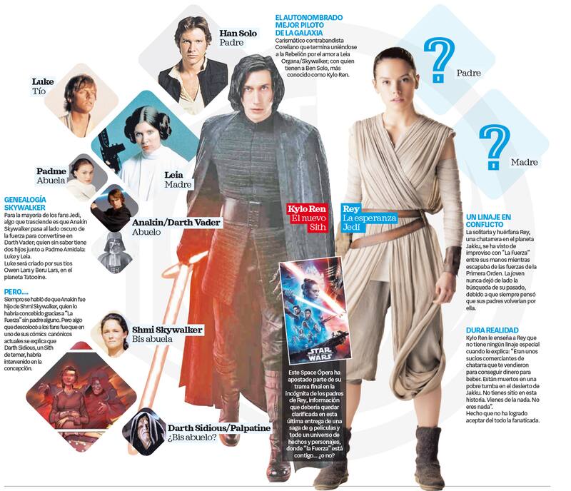 La guerra de las Galaxias es el space ópera por excelencia, la obra de ficción y aventuras de una genealogía única construida gracias a "La Fuerza" y el empeño visionario de su creador George Lucas. Ahora, este 19 de Diciembre, se marca el fin de una familia de Jedis y Siths que se enfrentarán como nunca en el episodio IX 'El ascenso de Skywalker' bajo la dirección de J. J. Abrams y la crítica mirada de la fanaticada.