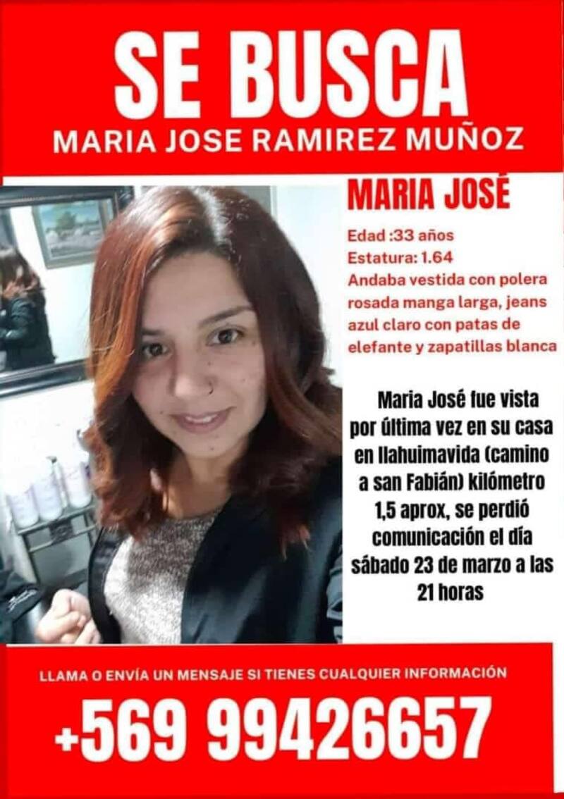 “A María José se le perdió el rastro el 23 de marzo, donde se ve abordando un auto cerca de las nueve de la noche en un paradero en el sector donde vivía. Era una camioneta blanca, después que se subió, de ella ya no se supo más”, relató Keimy Sepúlveda, amiga de Ramírez y quien es la vocera de la familia, reveló al medio Crónica Chillán.