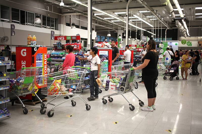 Es el horario de atención del supermercado ante la contingencia. Además, cuenta con un horario exclusivo para personas de la tercera edad (+60), embarazadas y movilidad reducida, entre las 8 y las 10 horas. También ofrecen un servicio de entrega a domicilio a través de su página web, con un estricto código de seguridad para evitar el contagio, donde el trabajador guarda una distancia de dos metros con el cliente y mantiene un uso constante de guantes de látex. Con sus trabajadores, en tanto, el recinto instaló mamparas de policarbonato para proteger a las cajeras, además de controles diarios de temperatura de sus trabajadores.