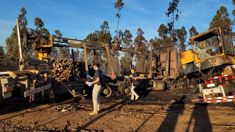 De acuerdo a la información policial, un grupo de sujetos a rostro cubierto apareció desde un bosque para intimidar con armas a los operarios y proceder a prender fuego a la maquinaria forestal.