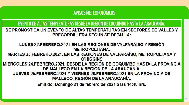 La Dirección Meteorológica de Chile anunció un ciclo de altas temperaturas que se presentará durante esta semana en la zona central del país.