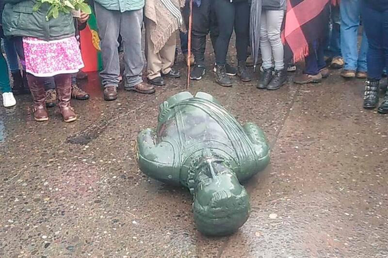 Resulta que entre las calles Balmaceda y Caupolicán, un grupo que acudió a las movilizaciones convocadas por distintas comunidades Mapuche derribó el busto de Pedro de Valdivia provisto solo de cuerdas, mientras que otros botaron la estatua de Diego Portales y colgaron una bandera en la figura de Arturo Prat Chacón.