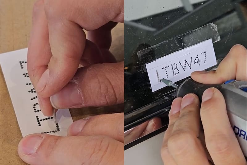 - El grabado en el auto se hace con una máquina Dremel con una punta diamantada o de carburo silicio a una velocidad de 15.000 rpm