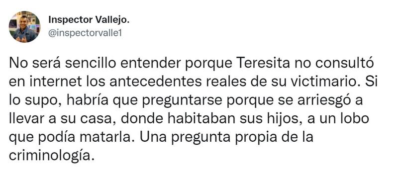 “No será sencillo entender porque Teresita no consultó en internet los antecedentes reales de su victimario. Si lo supo, habría que preguntarse porque se arriesgó a llevar a su casa, donde habitaban sus hijos, a un lobo que podía matarla. Una pregunta propia de la criminología”, expresó en su cuenta de Twitter.